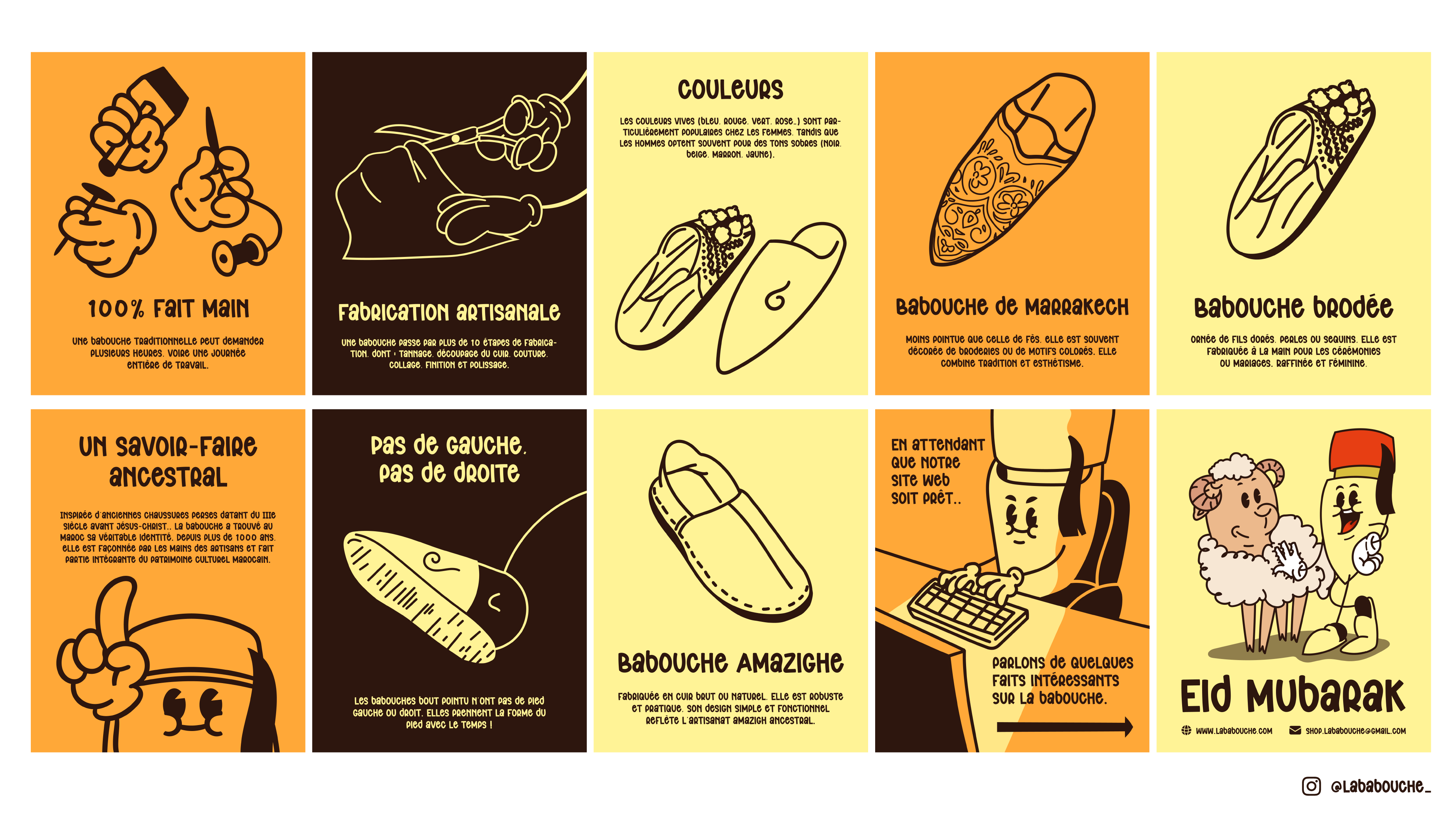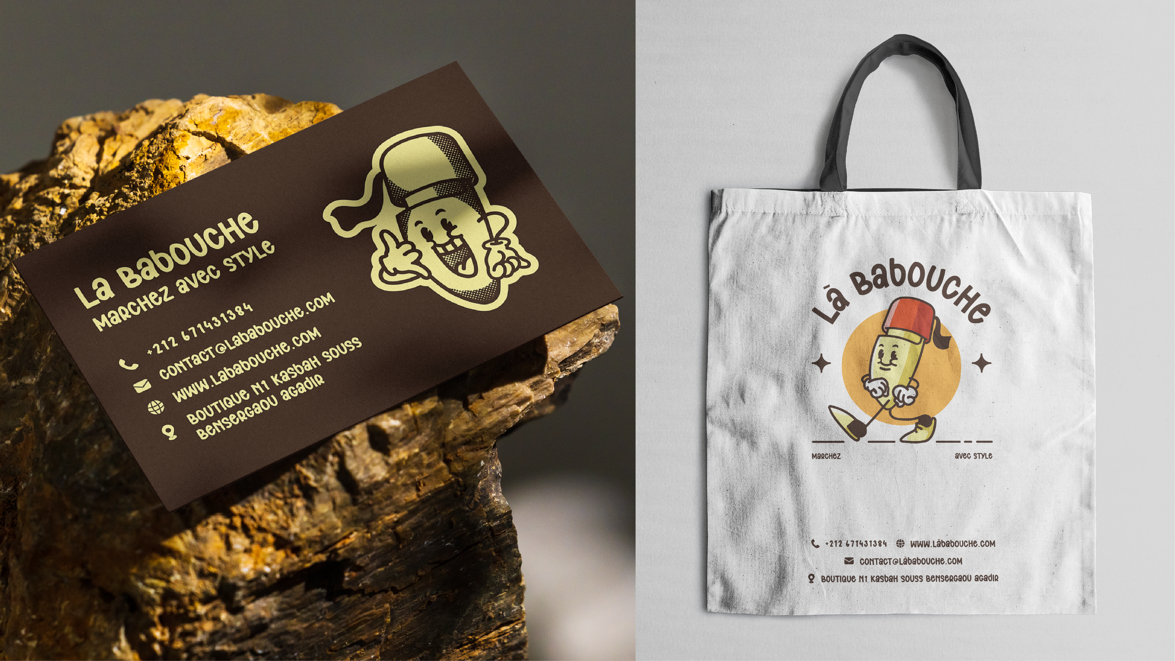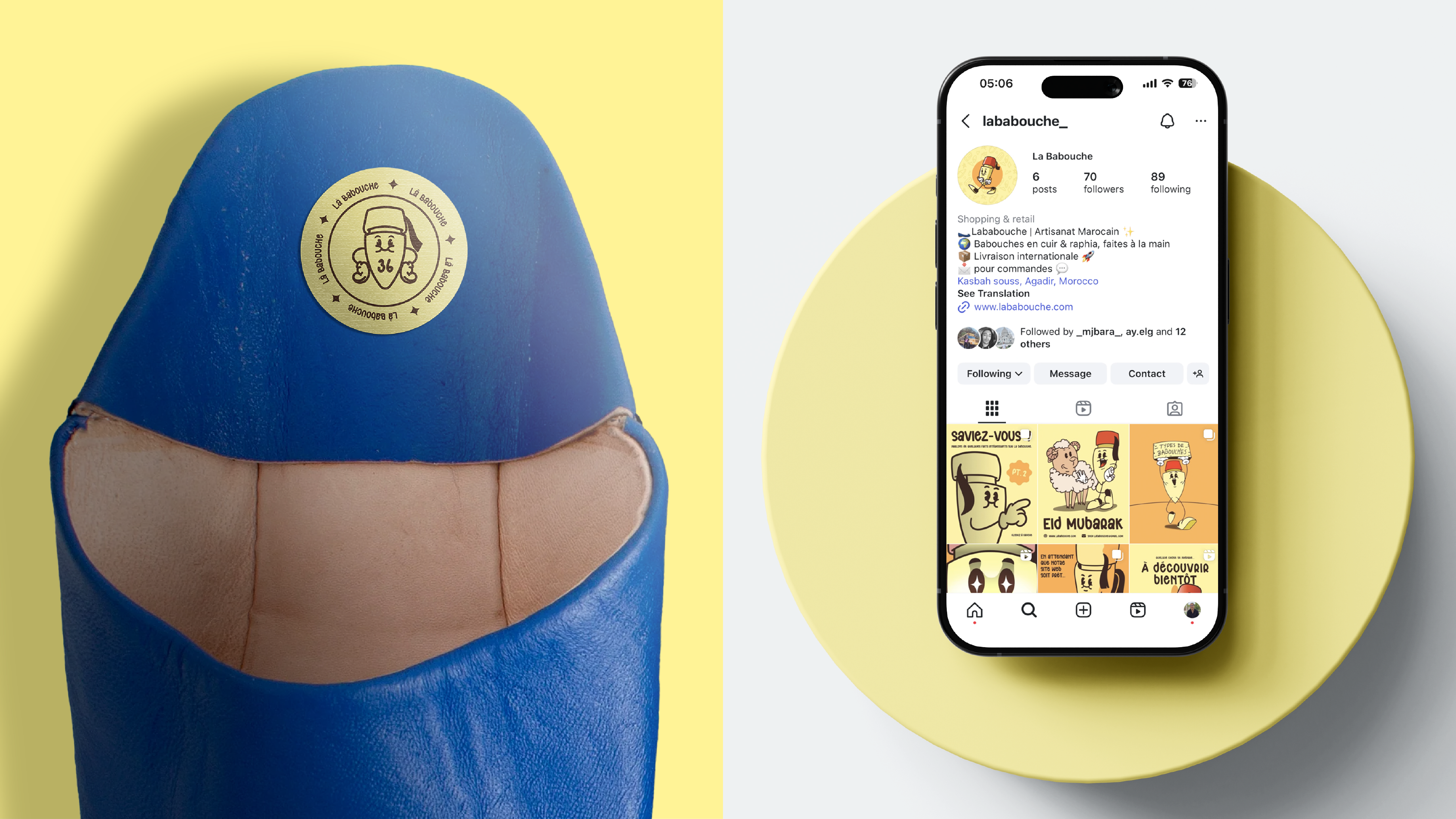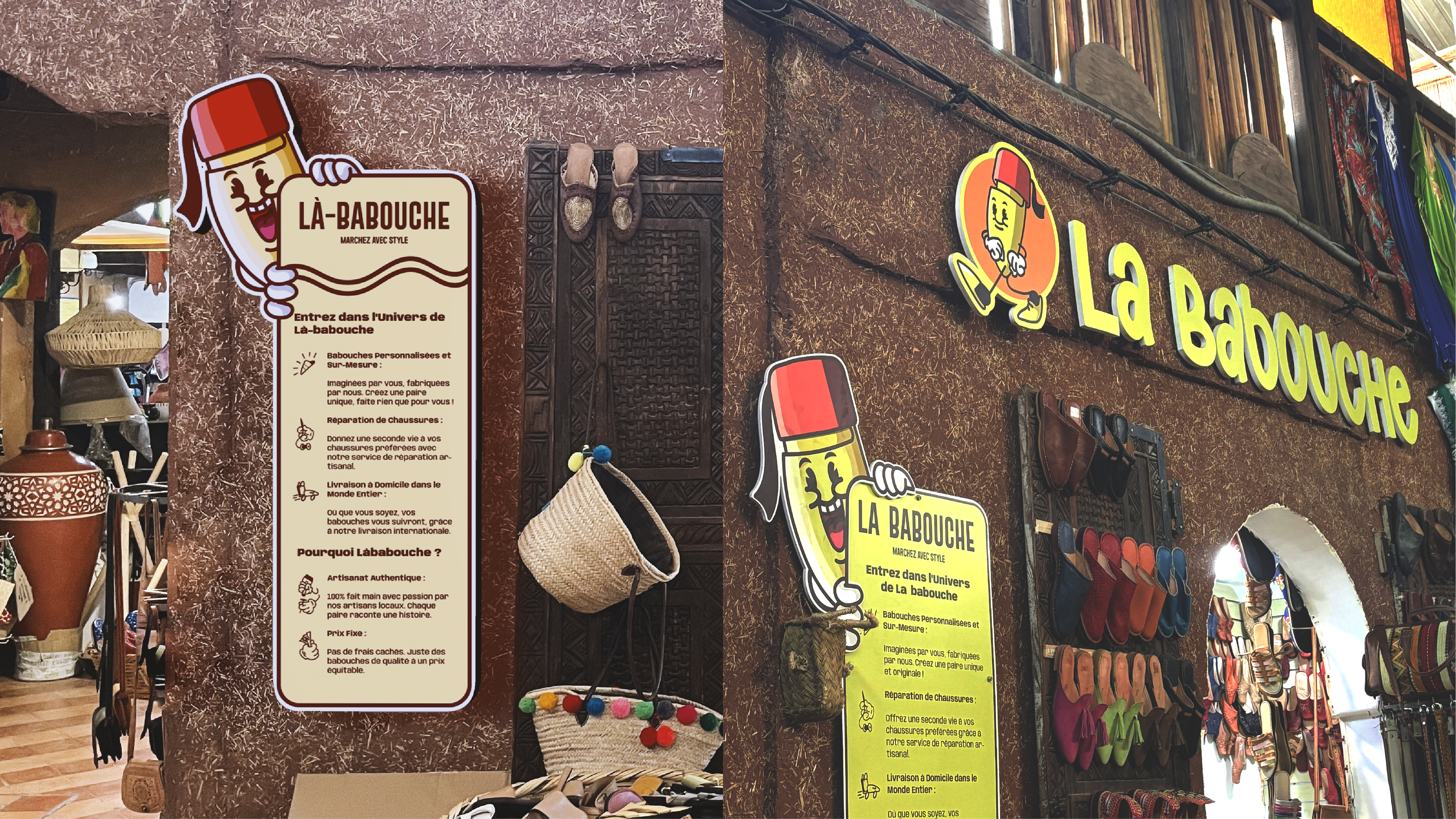 Là-Babouche branding is a playful take on the iconic Moroccan leather slipper, designed as a lively, hand-drawn character. My goal was to highlight the charm of this traditional accessory while giving it a modern, approachable feel. By blending a touch of whimsy with the authenticity of Moroccan craftsmanship, this branding showcases a cultural symbol in a fresh and engaging way, celebrating heritage with a creative twist.